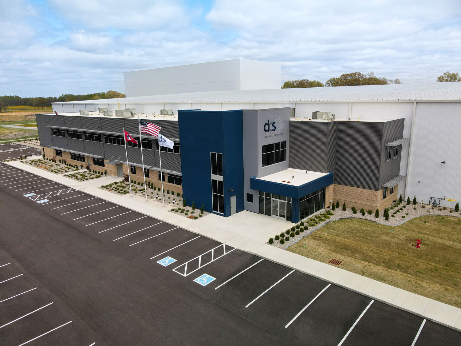 Forcum Lannom Contractors was pleased to complete the construction of a new 239,801-square foot Distribution Facility for Direct Customer Solutions. For this project, we installed approximately 45,096,000 pounds of concrete, 176,000 pounds of building structural steel in the Office area and 700,000 pounds in the Warehouse area, and 6,300,000 pounds of imported steel in the High Bay area. The building site is 49.7 acres and boasts a ground-mounted water storage tank that stores 200,000 gallons of water.